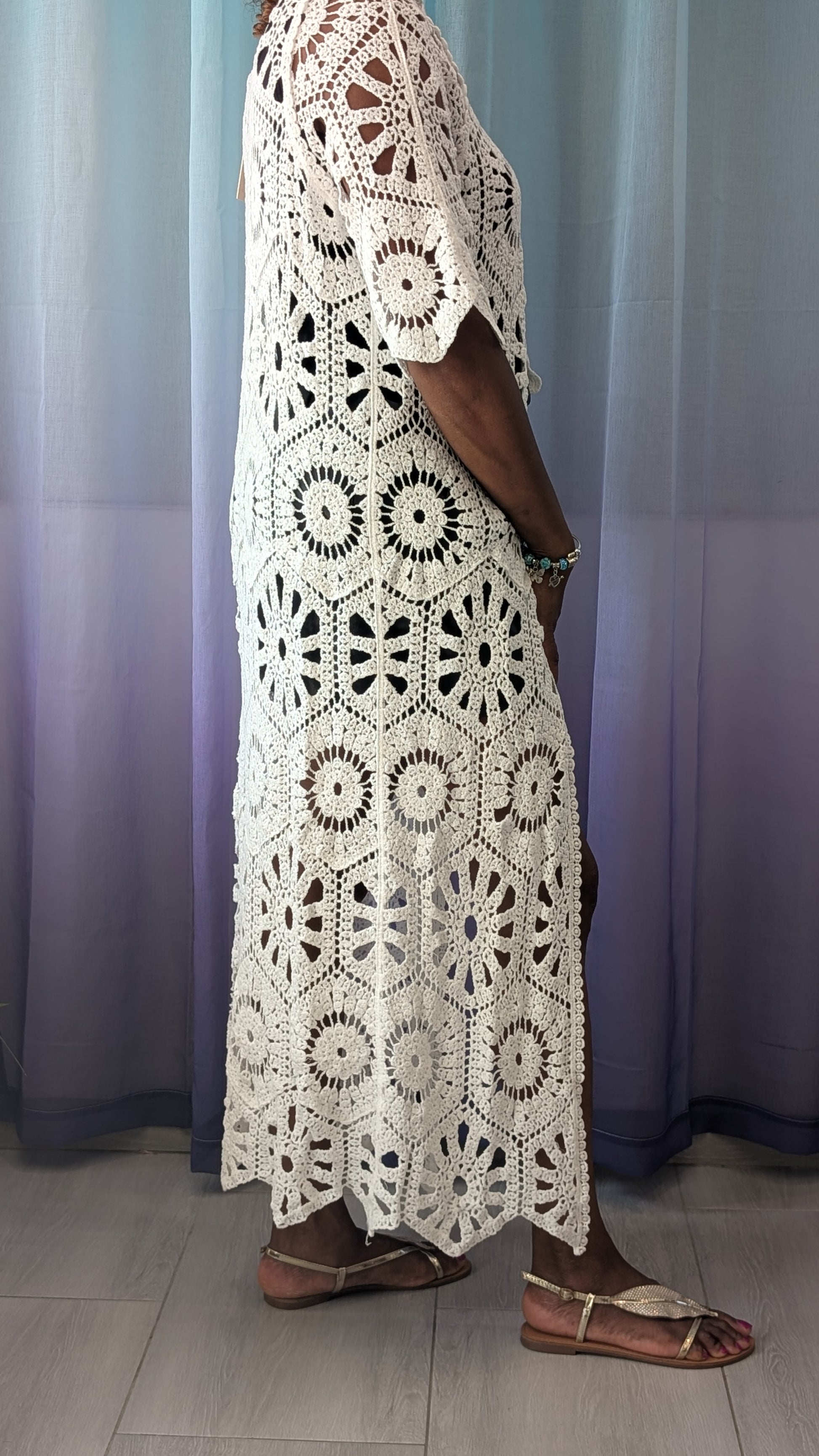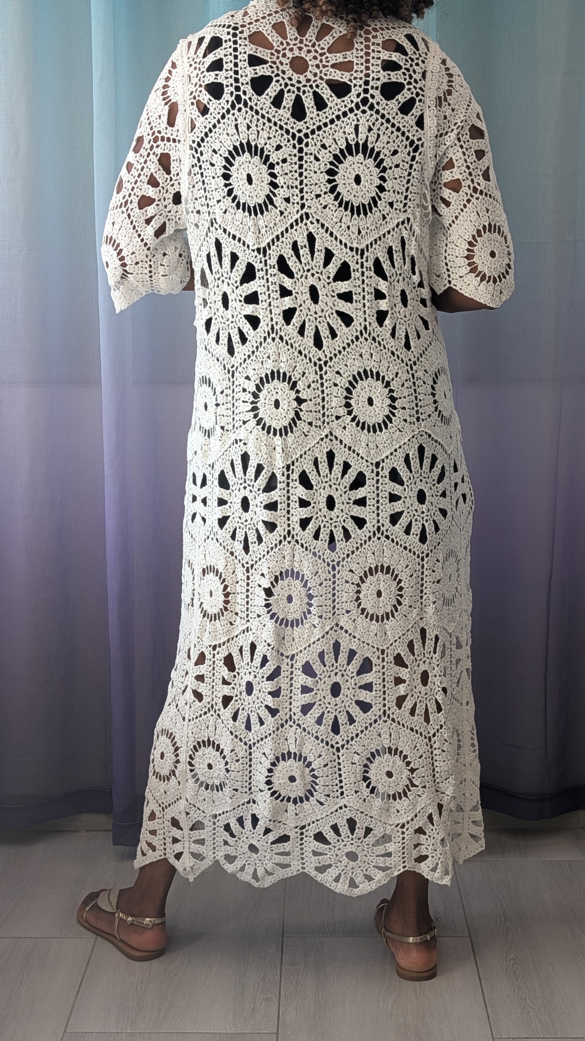 Léger comme une caresse et délicatement transparent, Alma Blanca est le kimono en dentelle qui habille sans jamais couvrir. Ses motifs ajourés laissent filtrer la lumière et subliment la peau dorée par le soleil. Ouvert, fluide, il se dépose sur les épaules comme une brise douce en fin de journée. À porter à la plage, en terrasse ou même à la maison, pour celles qui aiment mêler élégance, naturel et liberté, jusque dans les moindres détails.