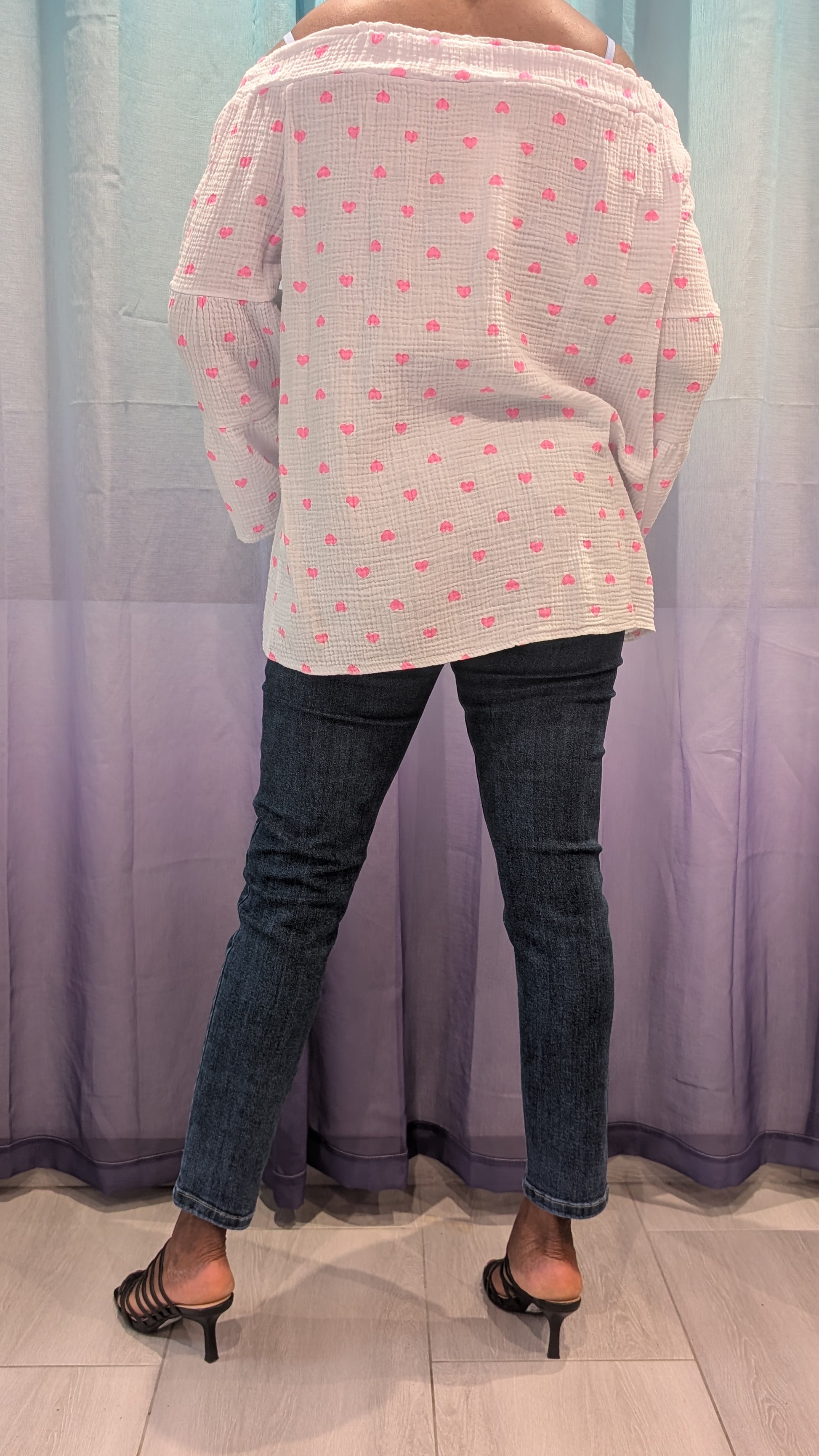 Un souffle de tendresse avec ce haut en gaze de coton parsemé de petits cœurs roses. Son encolure bardot met joliment les épaules en valeur, tandis que les manches évasées ajoutent une touche bohème et romantique. Léger, doux et joyeux, il se porte aussi bien avec un jean qu’avec un short pour un look estival plein de charme.