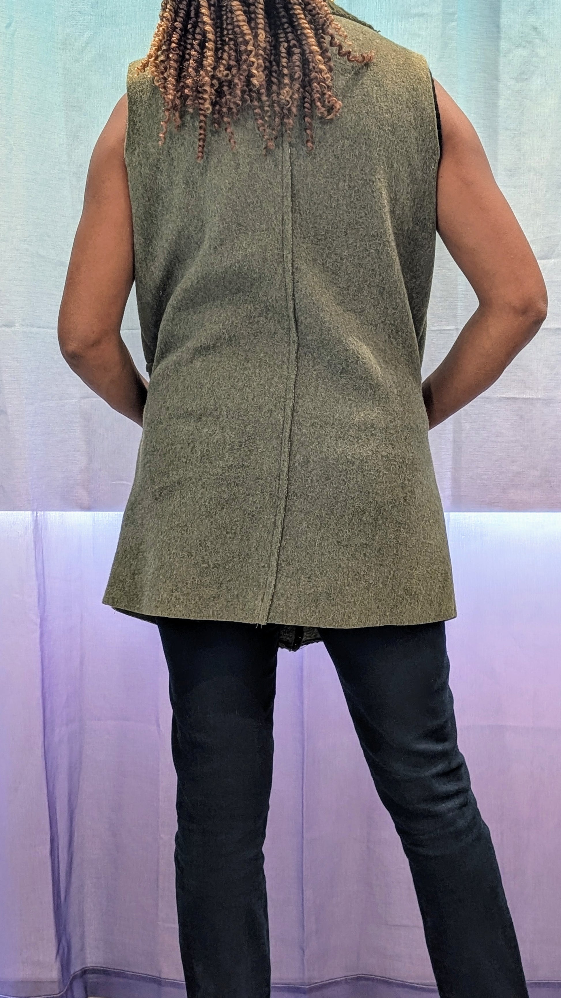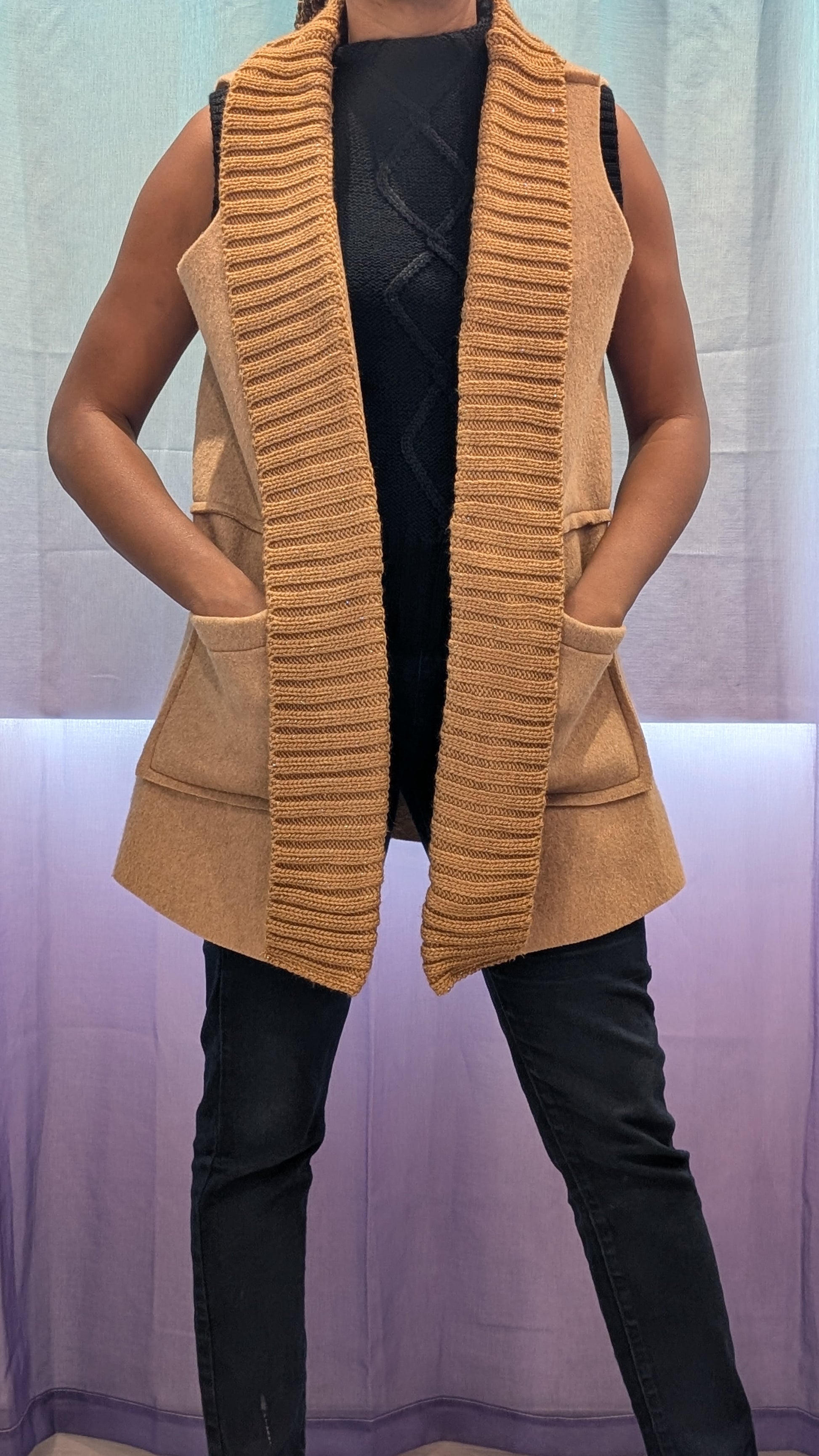 Cosyline est un gilet sans manches qui combine confort et élégance. Son col large en maille côtelée crée une allure moderne et enveloppante, tandis que sa coupe droite et ses poches pratiques ajoutent une touche décontractée. Idéal pour réchauffer une tenue tout en gardant une silhouette raffinée.