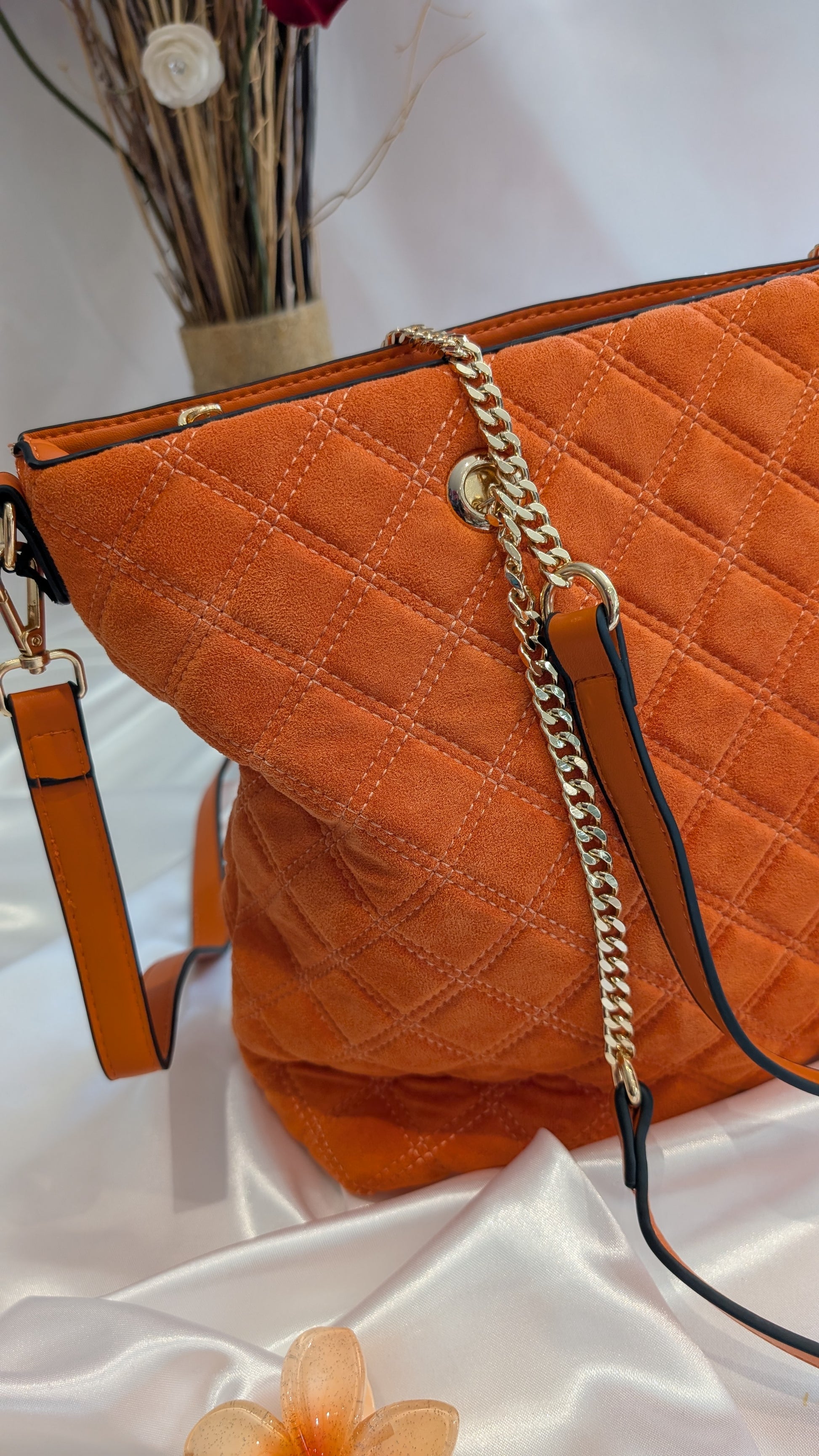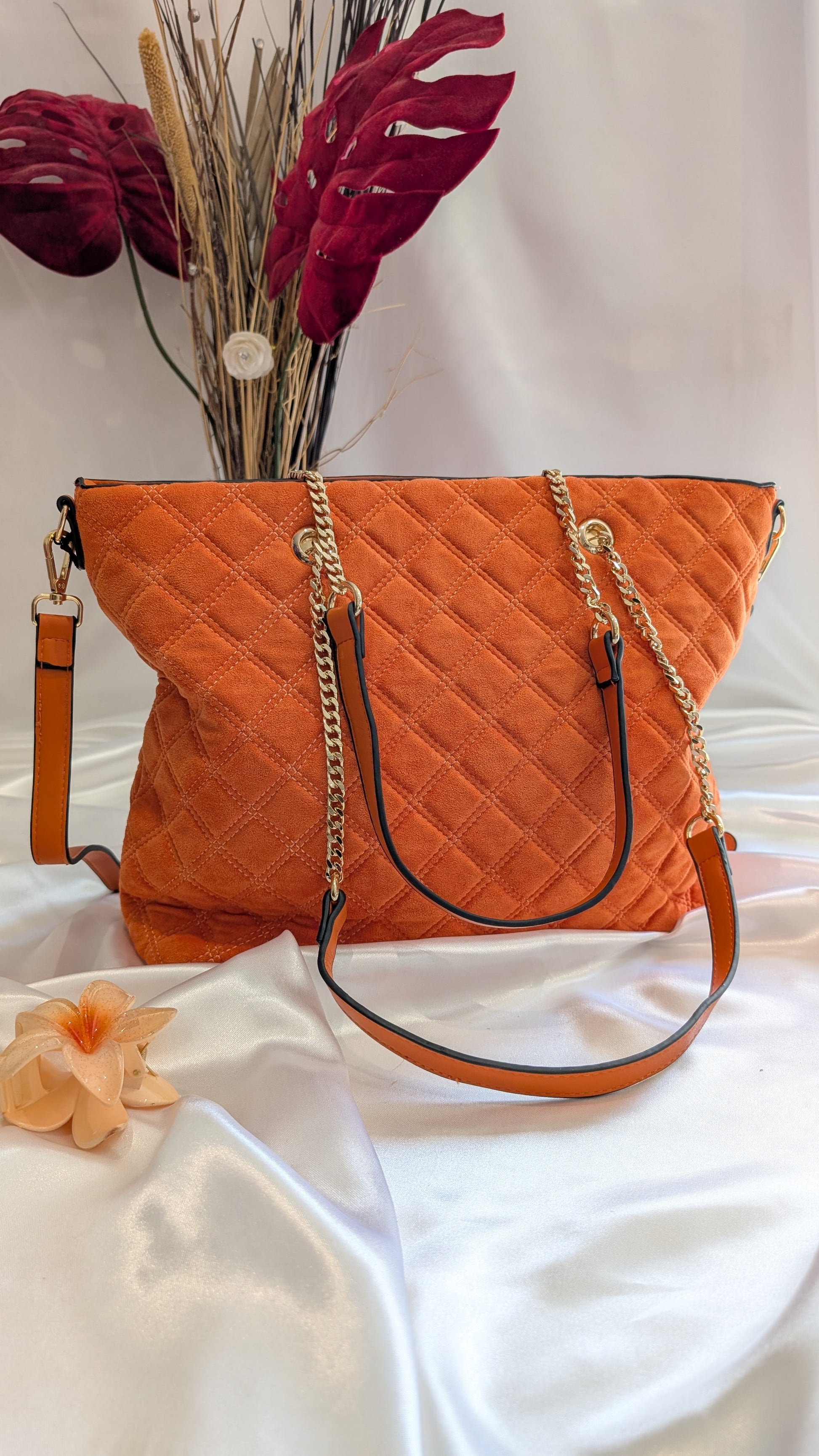 Un grand sac matelassé en suédine orange, sublimé par des anses en chaîne dorée. Nectar est l’allié idéal pour conjuguer praticité et allure sophistiquée.