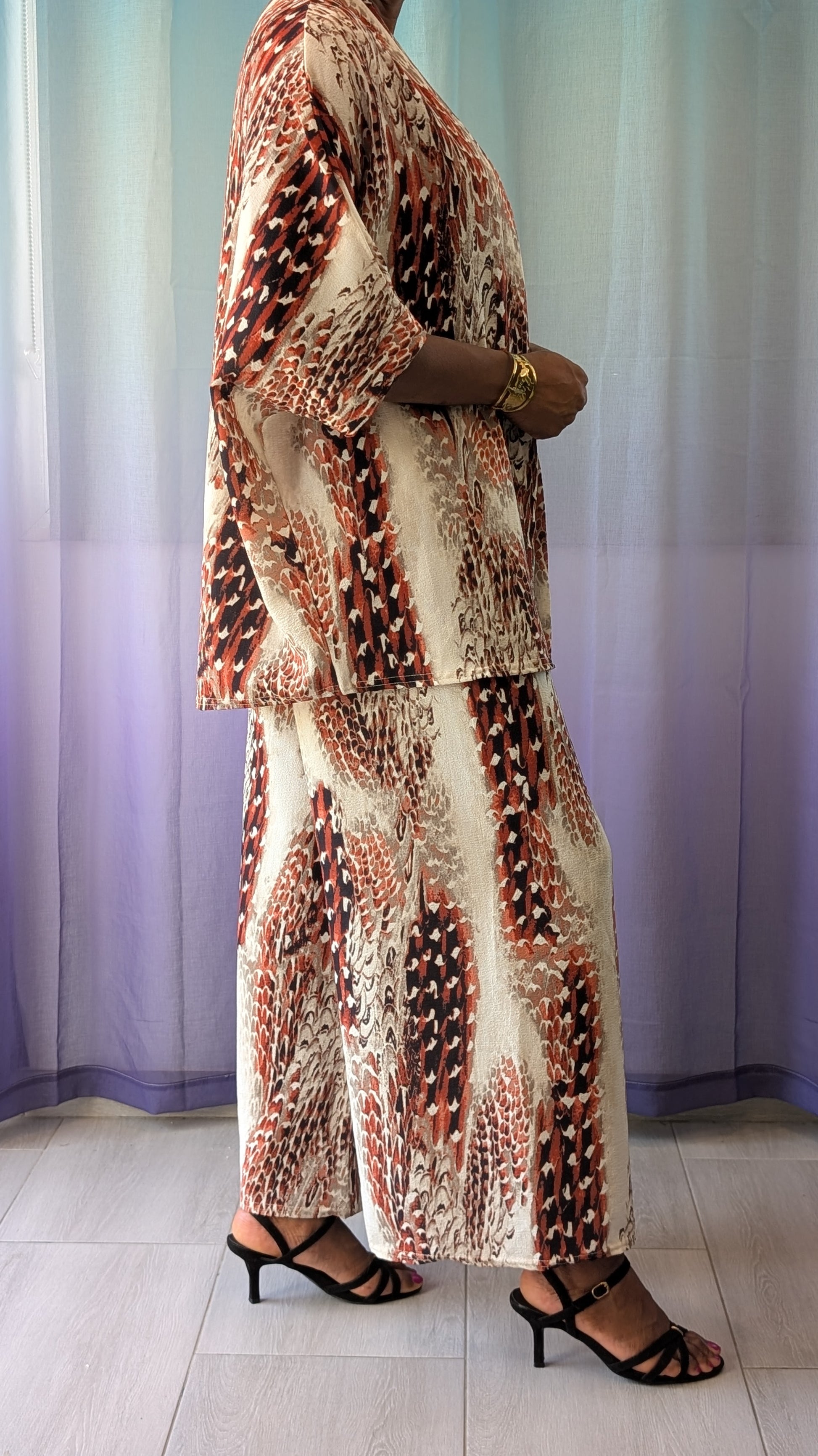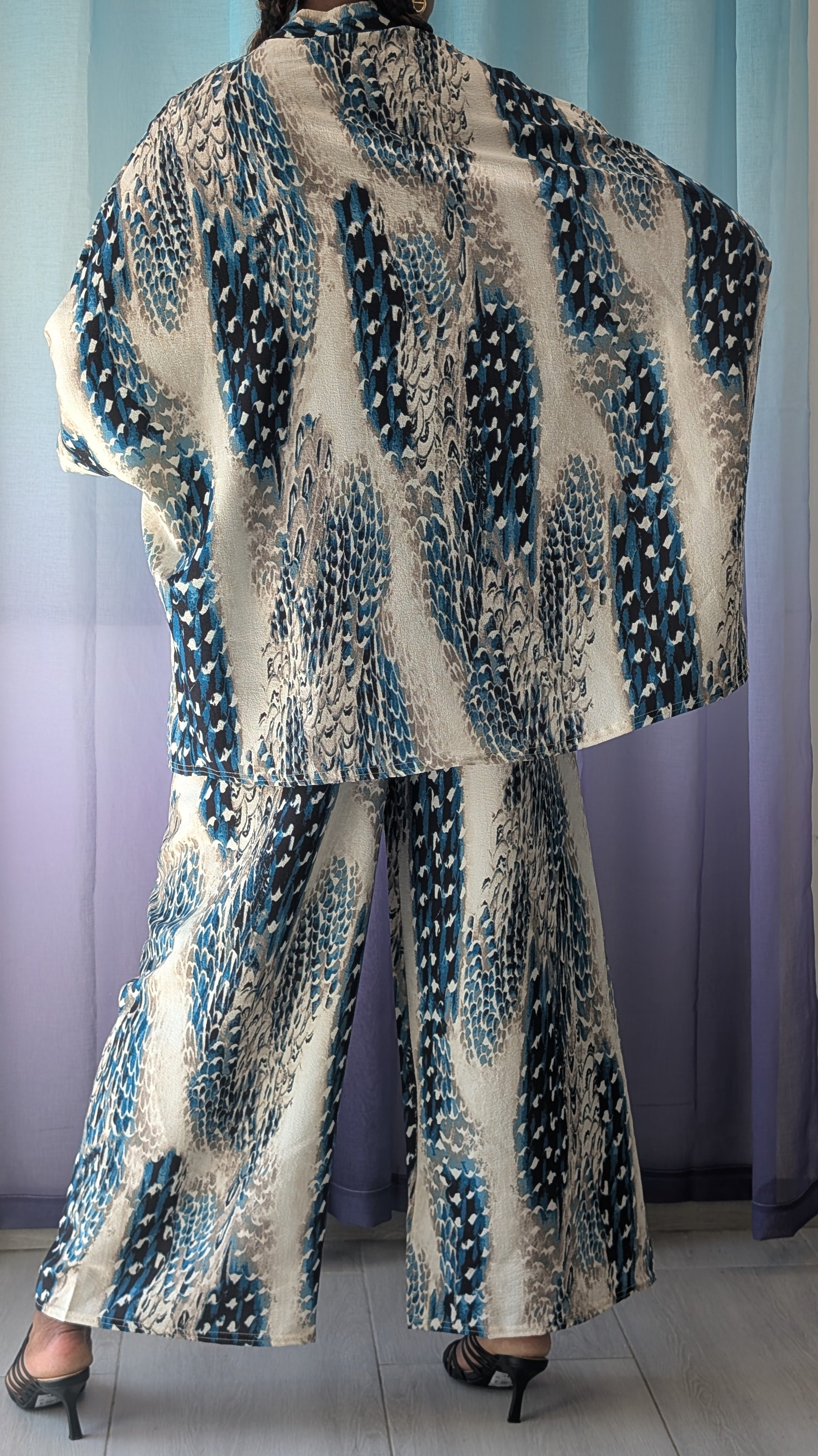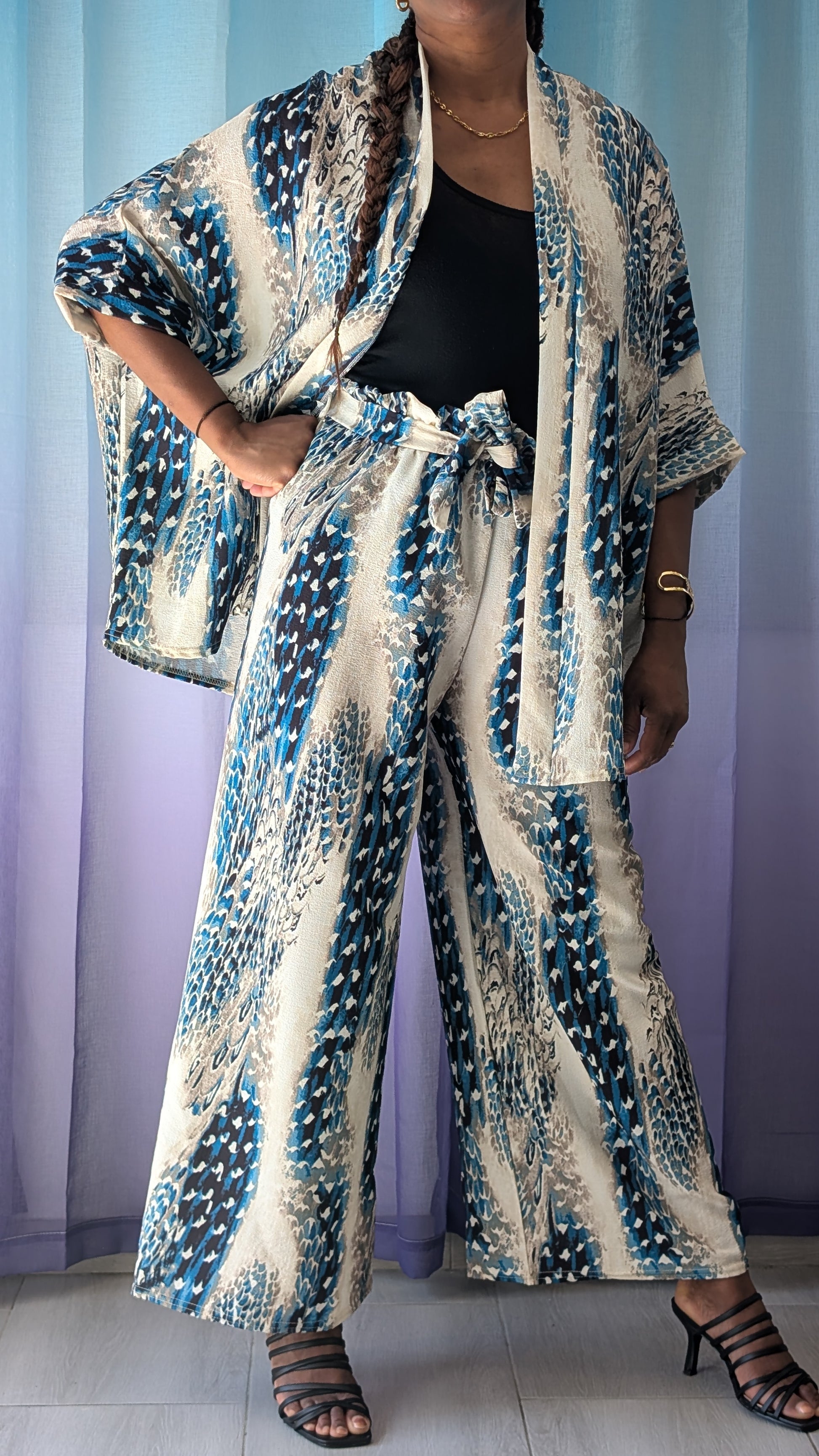 Une tenue fluide et raffinée, où le bleu profond rencontre la légèreté des motifs. Inspirée par l’élégance naturelle et le mouvement, elle incarne une allure libre, simple et pleine de caractère.