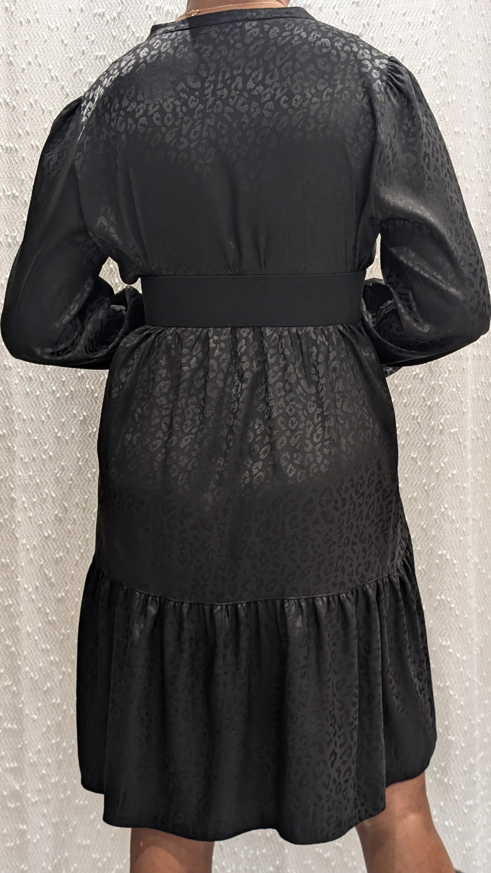 La robe Éléonore séduit par son élégance discrète et sa féminité. Réalisée dans un tissu noir à motif ton sur ton, elle présente un décolleté en V, des manches longues légèrement bouffantes et une taille marquée qui met en valeur la silhouette. Sa jupe fluide à volants apporte du mouvement et une allure raffinée, idéale pour une tenue chic au quotidien comme pour une occasion spéciale.