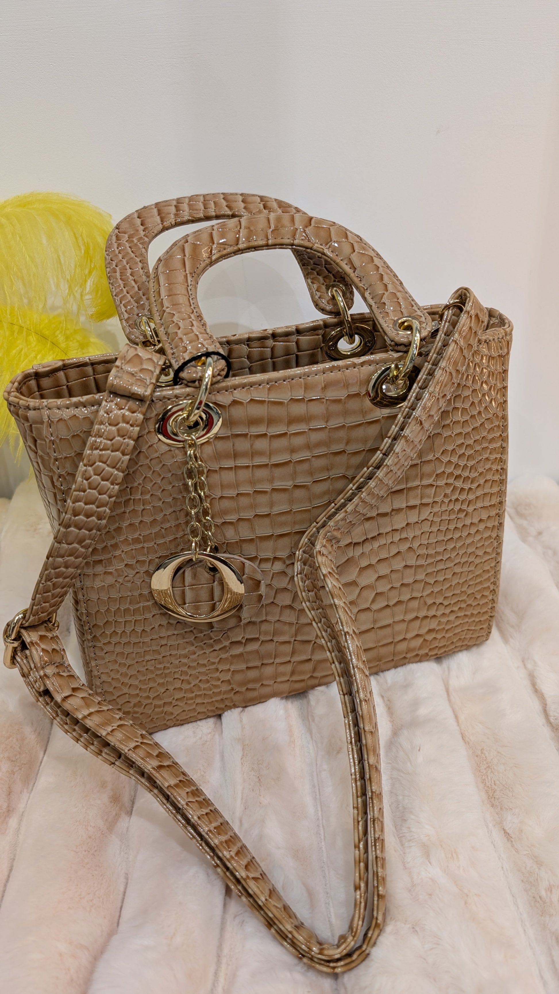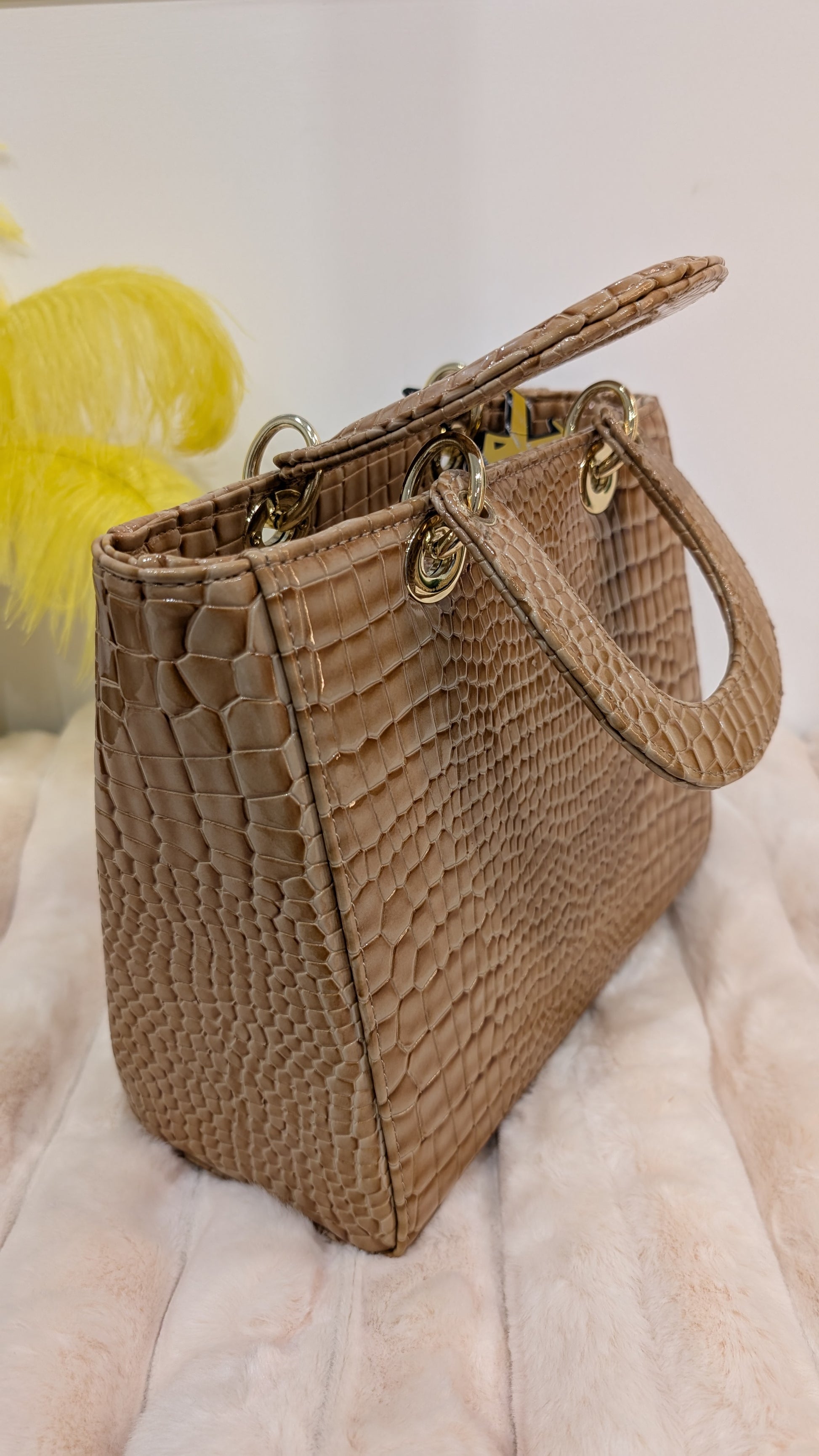 Un sac raffiné aux reflets bruns et aux motifs écaille élégants. Son éclat subtil et sa texture unique en font une pièce à la fois chic et intemporelle, idéale pour sublimer une tenue avec originalité.