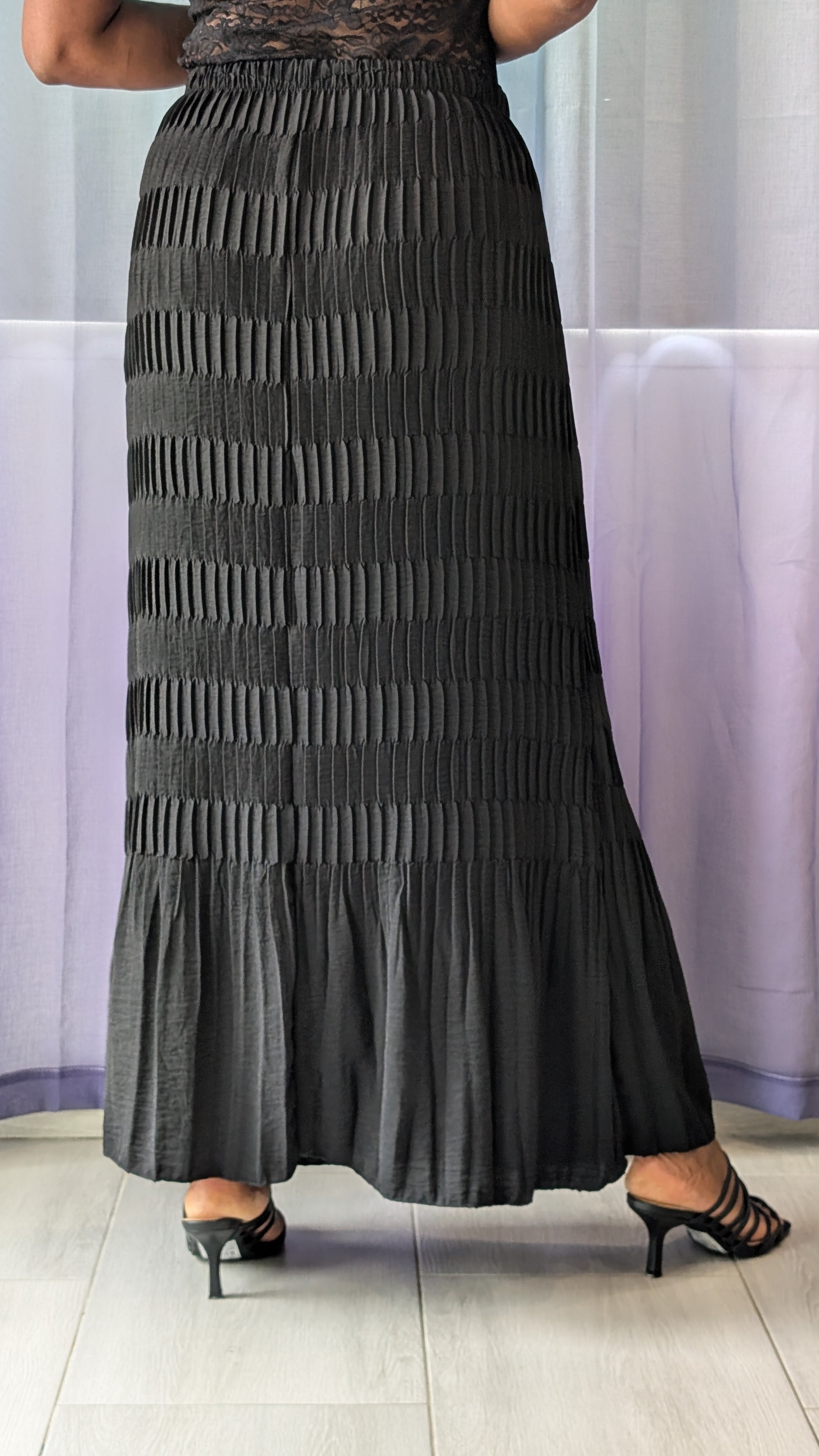 Jupe longue à la coupe fluide et élégamment plissée, conçue pour épouser les mouvements avec légèreté. Sa taille élastique à lien noué assure un confort optimal tout en sublimant la silhouette. Un modèle polyvalent, à la fois raffiné et facile à porter, qui s’adapte à toutes les saisons et toutes les occasions.