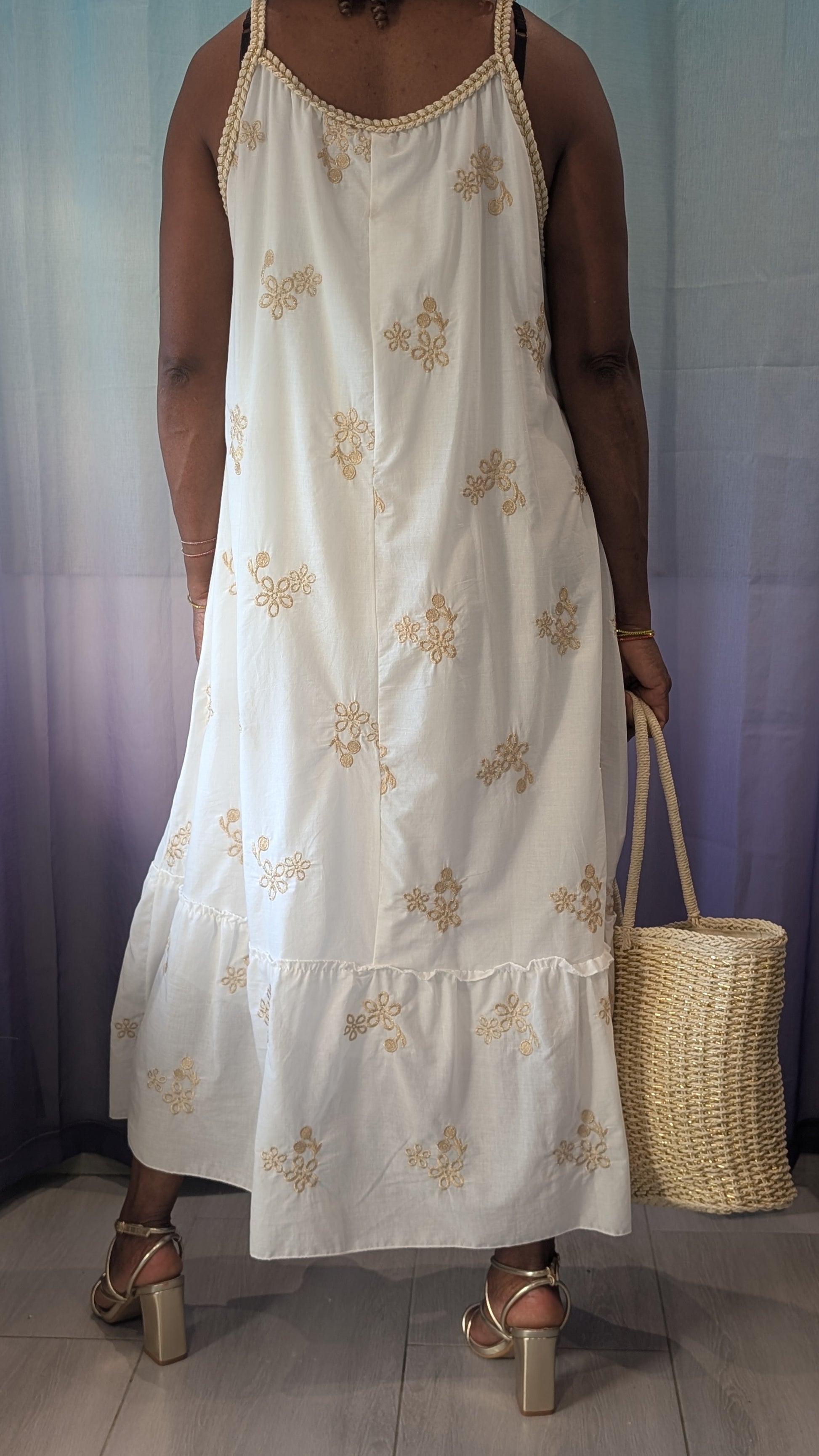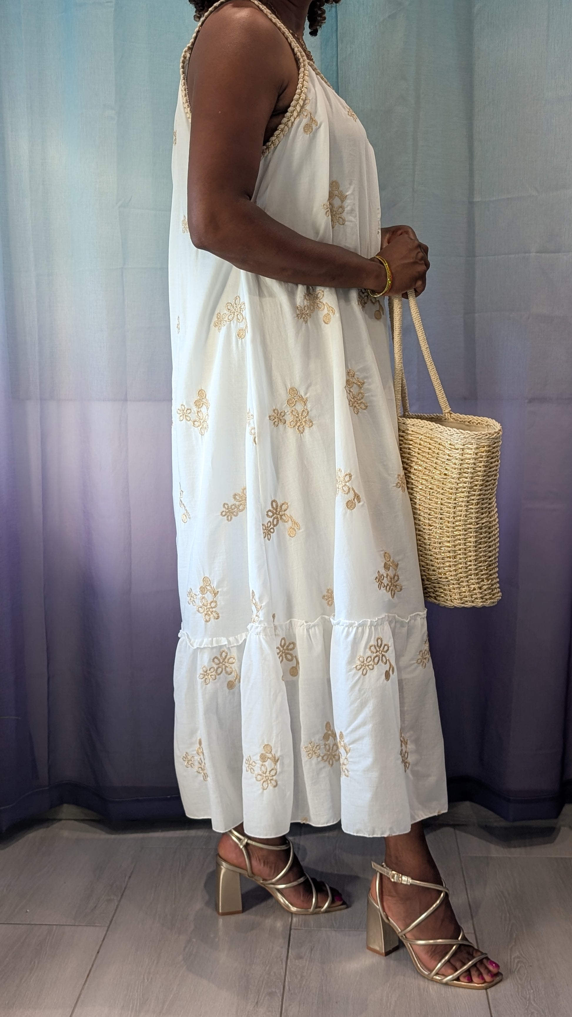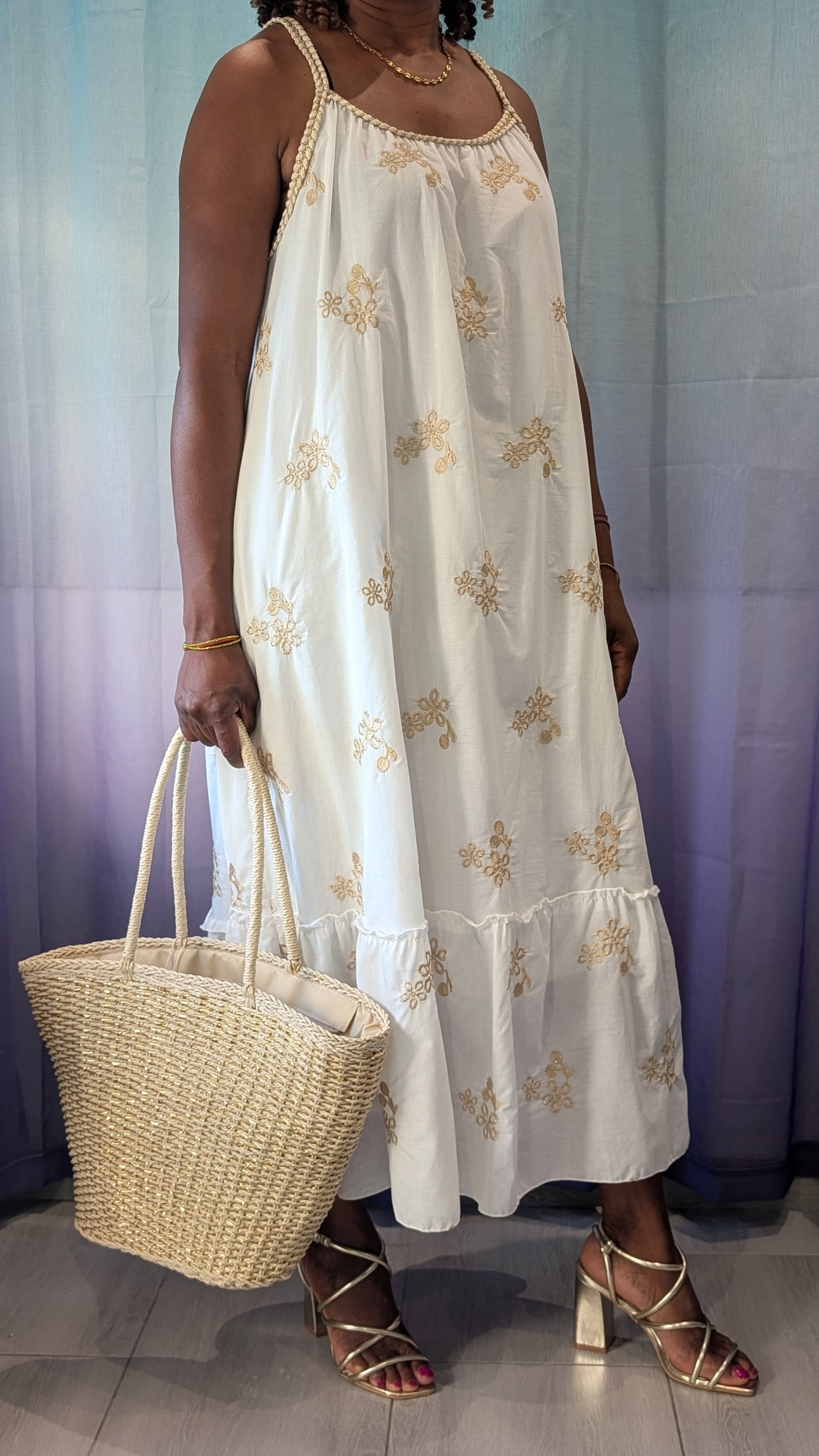 Fil d' Or incarne l’élégance solaire dans sa forme la plus délicate. Cette robe blanche légère, sublimée par une broderie dorée aux motifs fins, capte la lumière à chaque mouvement. Son style à la fois épuré et lumineux évoque les soirées chaudes, les terrasses dorées et les balades sous les oliviers. Portée avec des sandales ou pieds nus sur le sable, elle devient un symbole de grâce naturelle, douce et rayonnante.