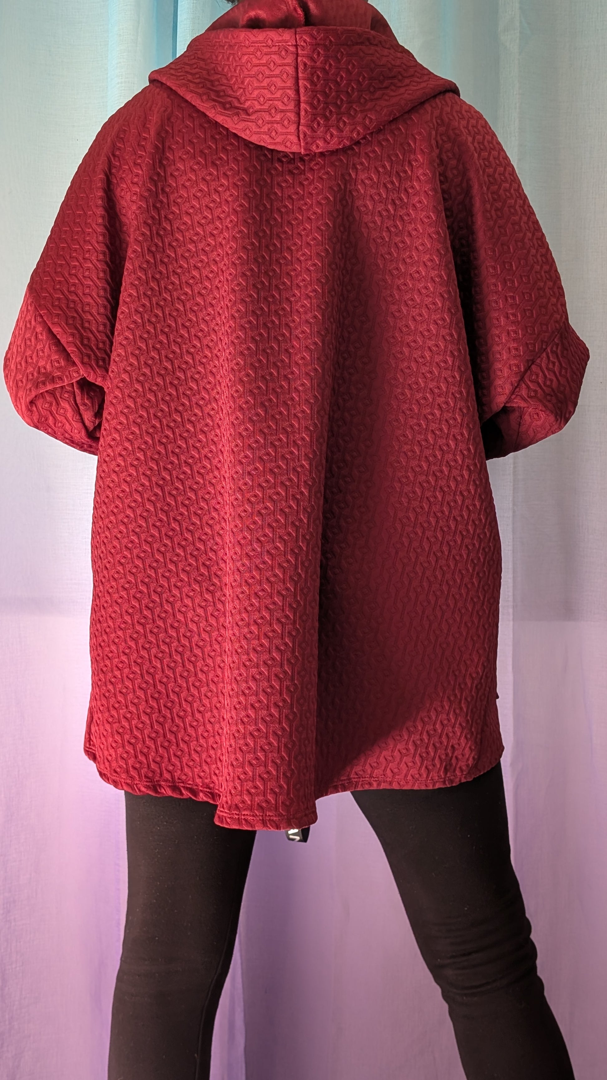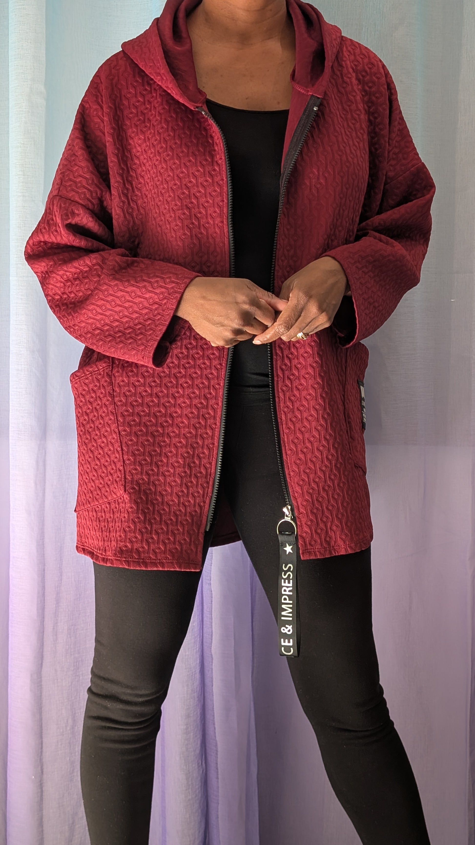 Veste zippée à capuche en relief géométrique, ample et confortable. Son rouge profond et sa texture unique en font une pièce streetwear chic, parfaite pour marier audace et décontraction.