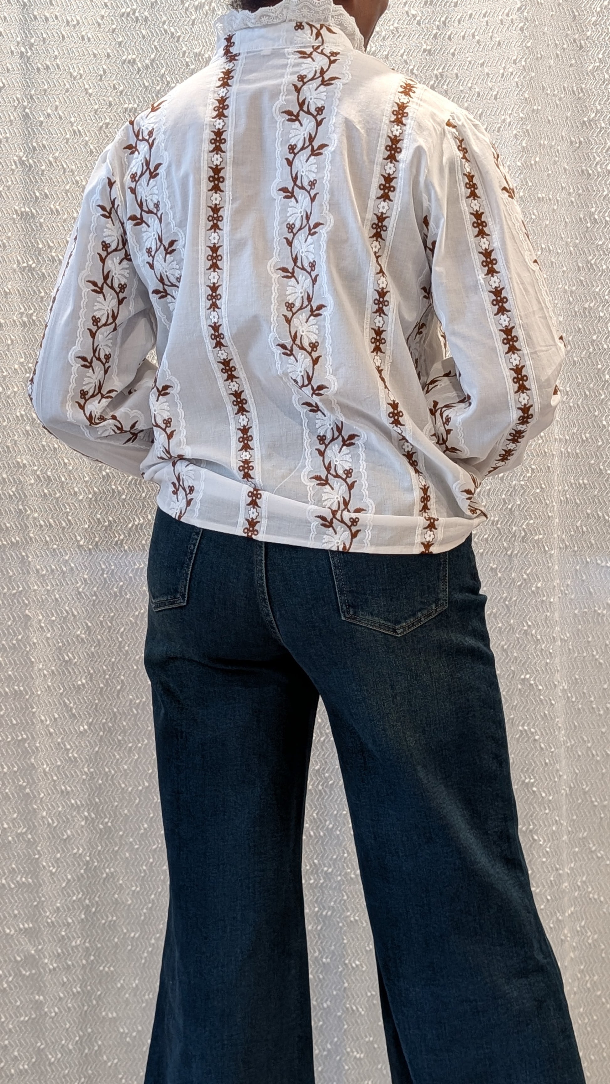 Blouse blanche raffinée ornée de broderies florales marron aux lignes verticales, Isadora allie douceur et caractère. Son tissu léger et légèrement transparent apporte de la délicatesse, tandis que les volants discrets sur le devant ajoutent une touche féminine et chic. Facile à associer avec un jean ou un pantalon habillé, c’est une pièce élégante qui traverse les saisons sans se démoder.