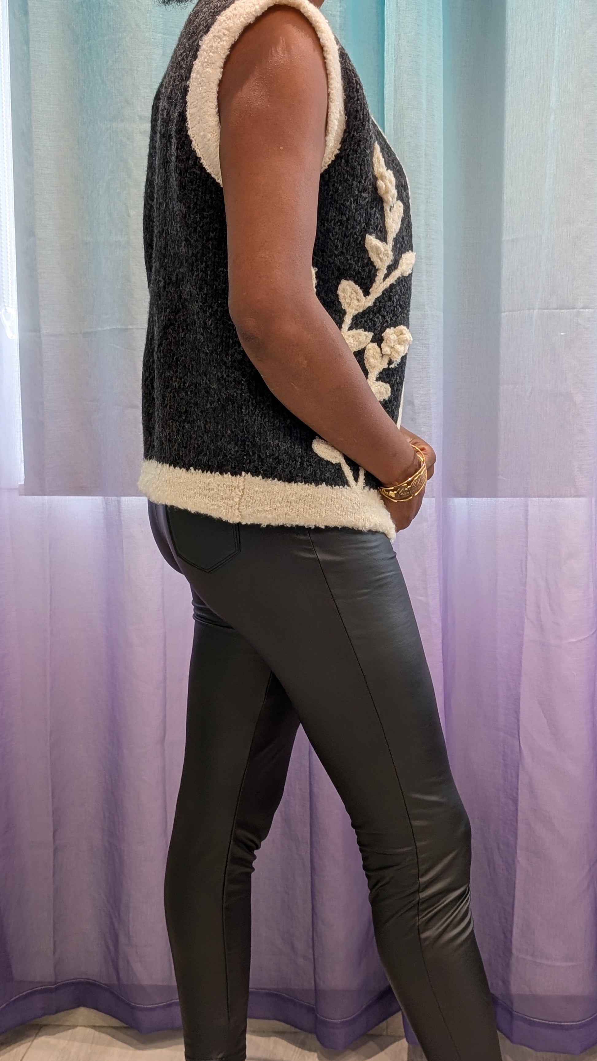 Haut sans manches style veste courte, confectionné en polyester doux et épais, avec un toucher laineux qui enveloppe de chaleur. L’élégance cosy réinventée pour vos looks urbains ou décontractés.