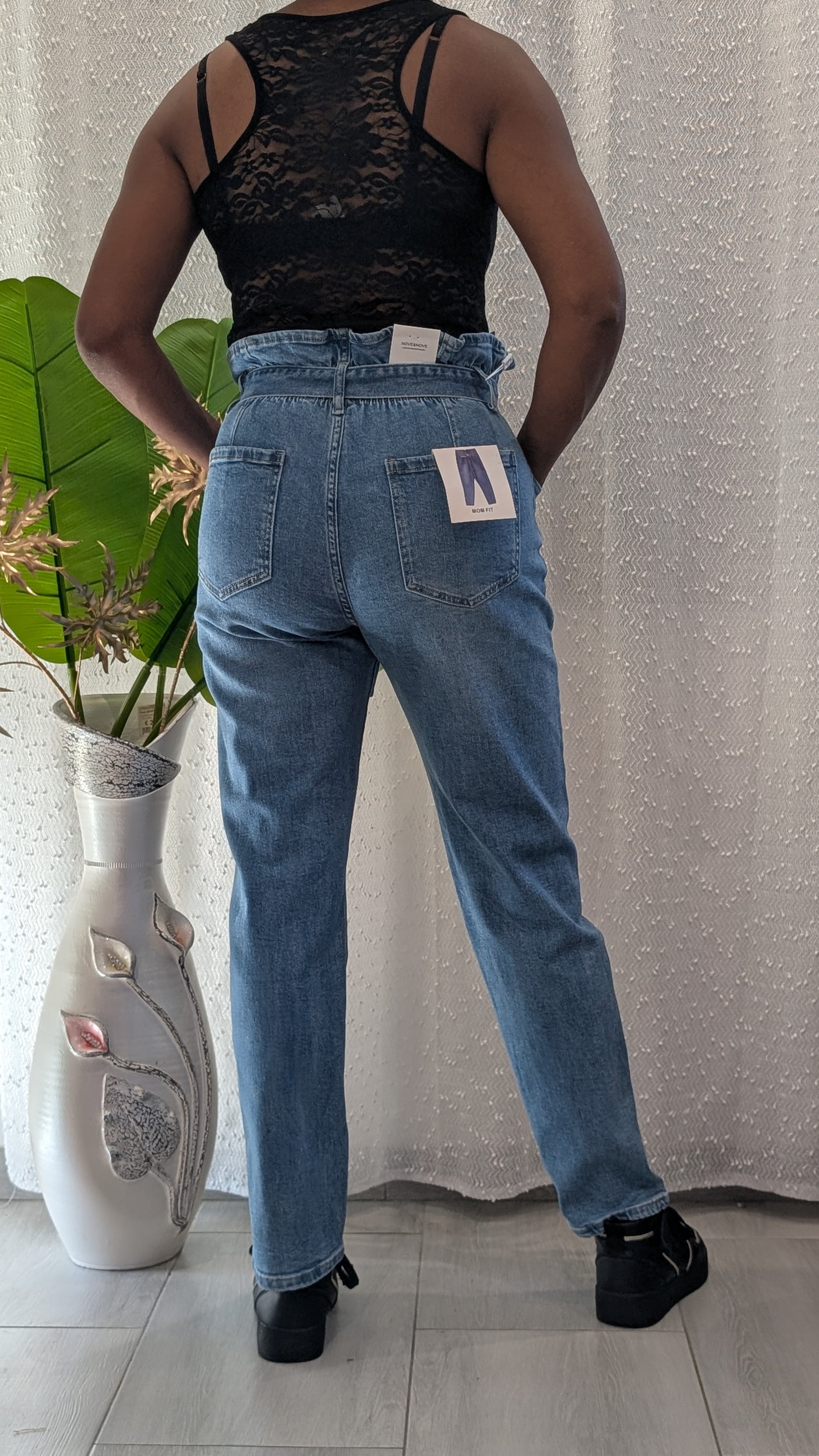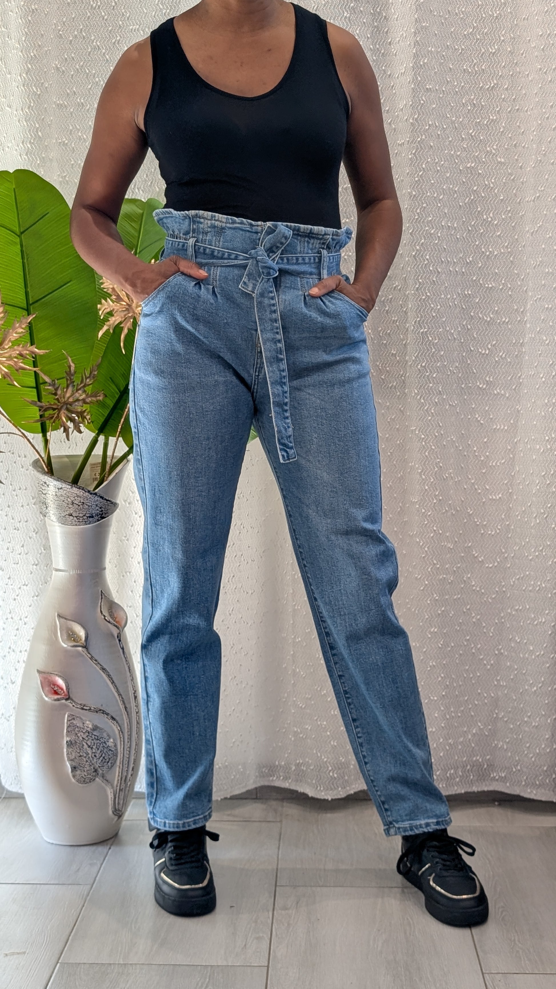 Nova est un jean taille haute au design paperbag, qui épouse la taille avec élégance et la souligne grâce à sa ceinture intégrée. Sa coupe droite et fluide élance la silhouette tout en offrant confort et modernité.