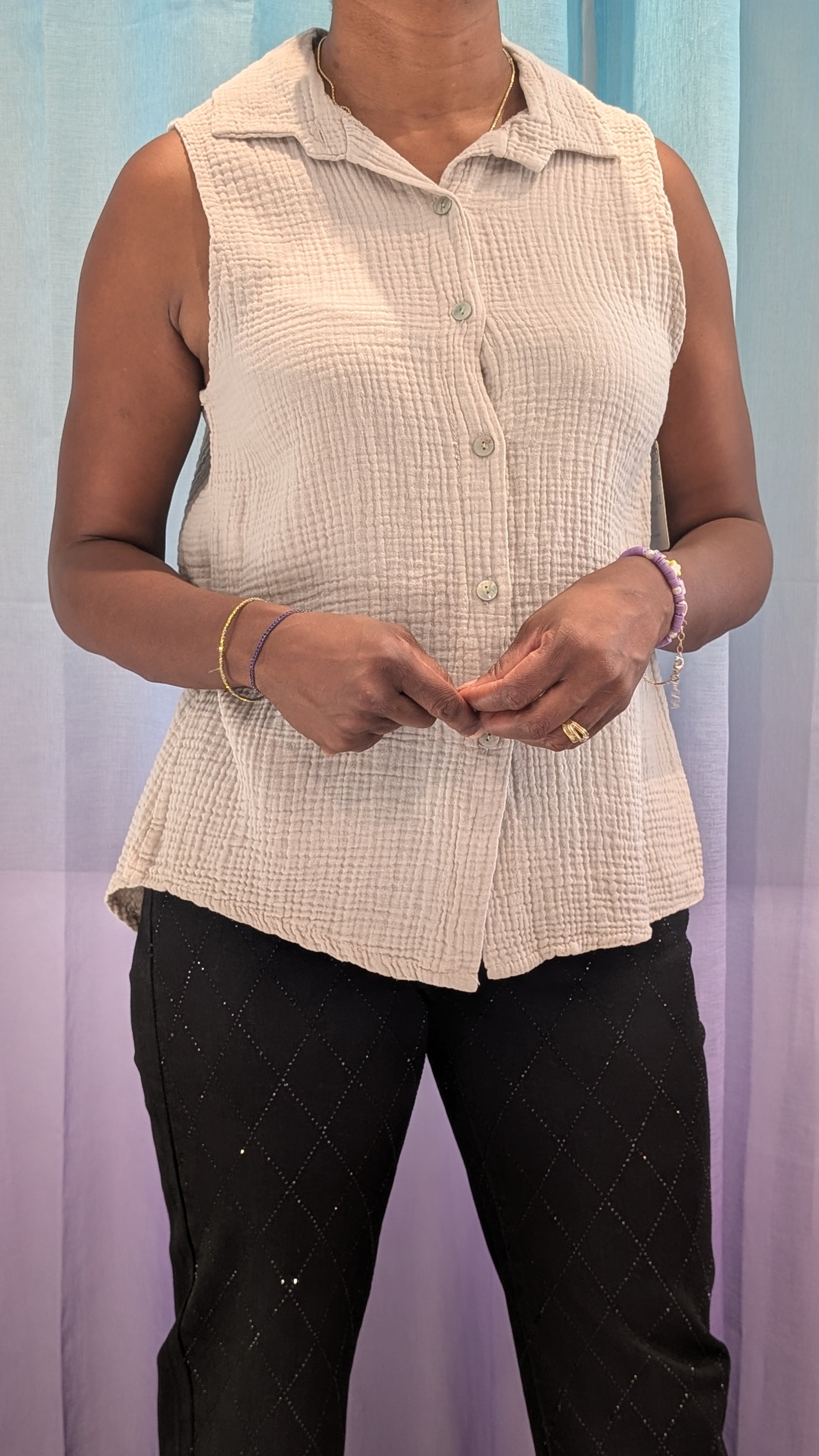 Fraîche et légère, cette chemise sans manches en gaze de coton est l’alliée parfaite des journées ensoleillées. Son tissu doux et texturé épouse délicatement la silhouette, tandis que sa coupe fluide assure un confort absolu. Facile à associer, elle se marie aussi bien avec un jean chic qu’un short décontracté. Le petit plus ? Son col élégant qui apporte une touche de structure à ce look tout en douceur.