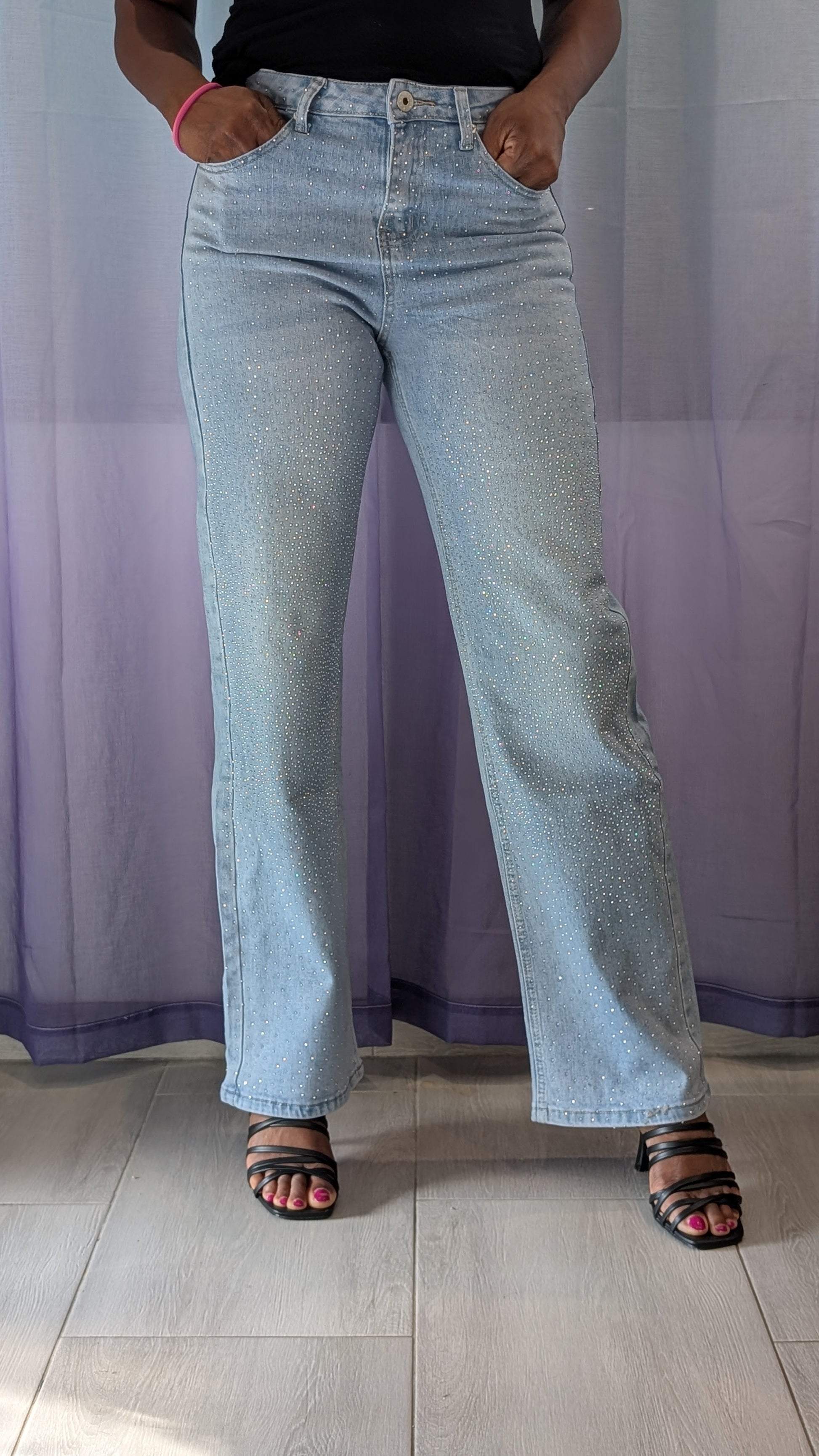 Un jean étincelant comme une nuit constellée. Recouvert de strass scintillants du haut jusqu’en bas, il capte la lumière sous tous les angles pour une silhouette lumineuse et affirmée. Idéal pour celles qui aiment briller avec audace.