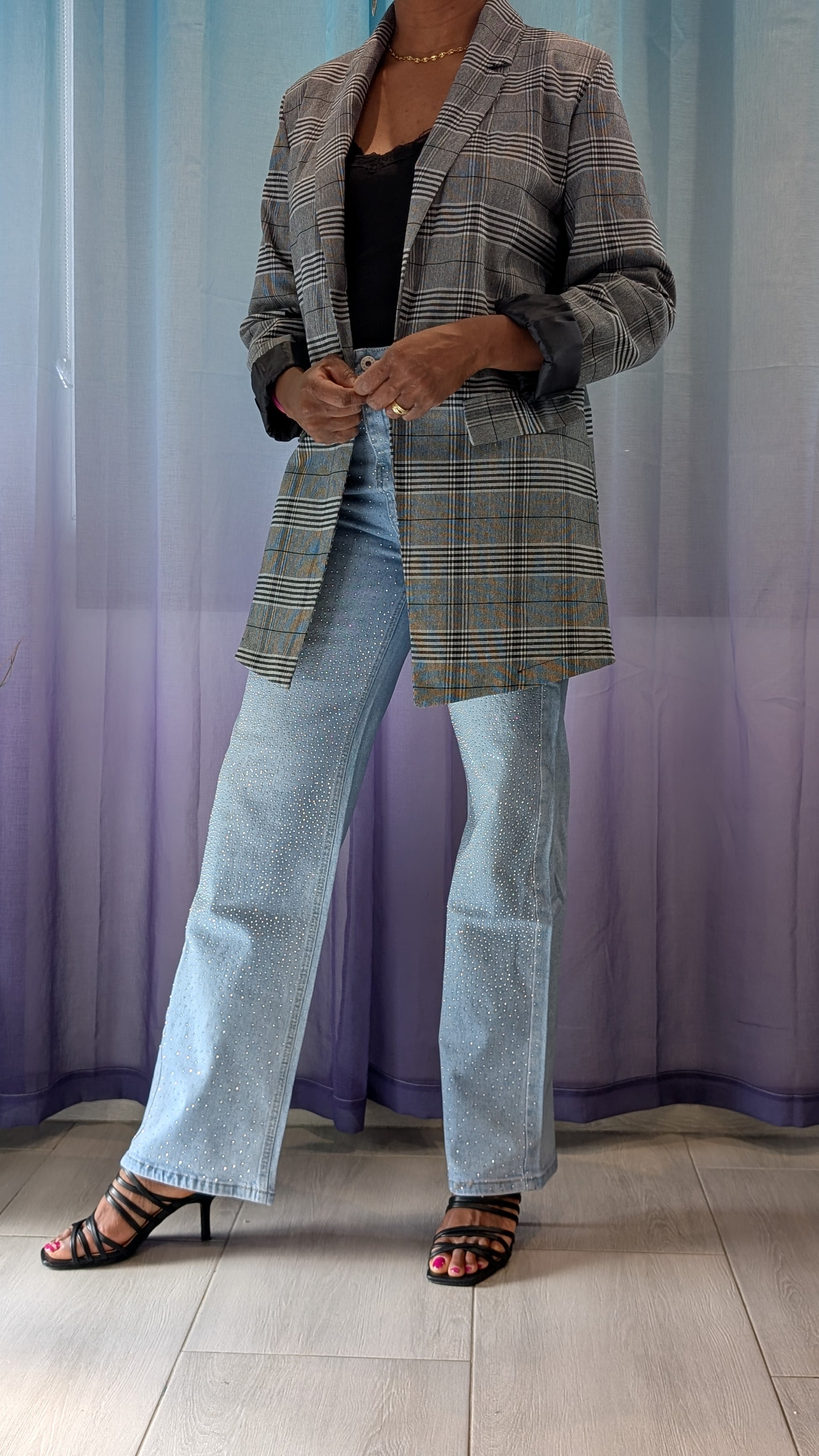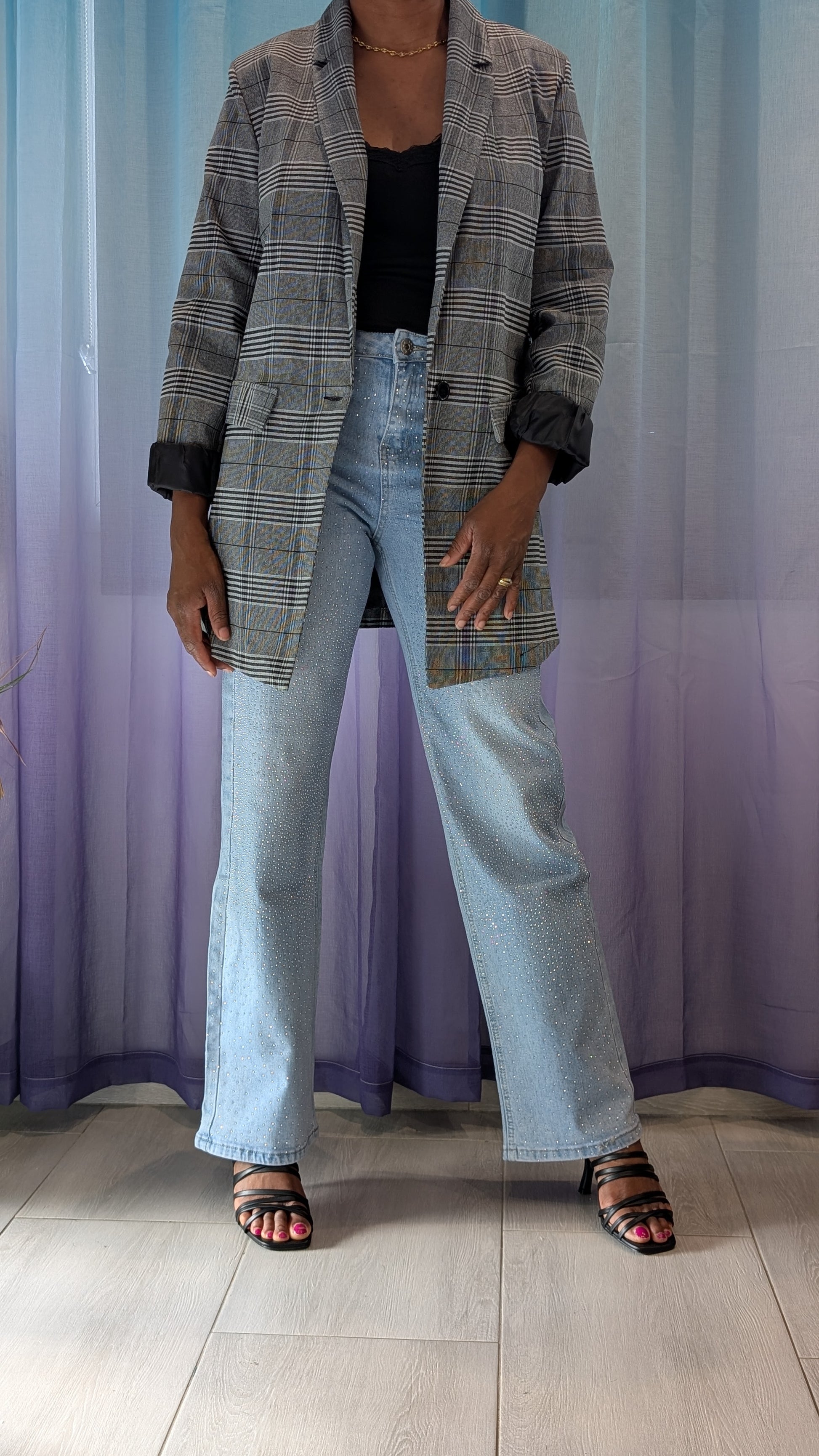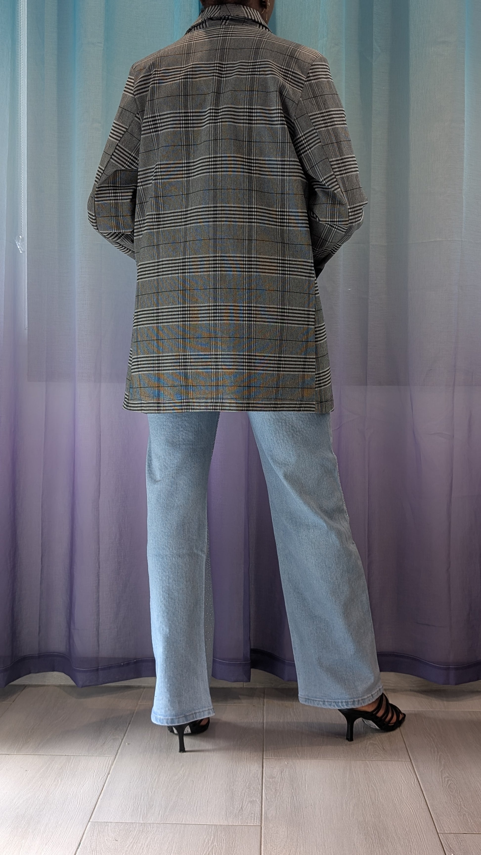 Blazer à carreaux style Prince de Galles, avec une coupe oversize qui structure la silhouette tout en restant confortable. Ses tons neutres s’accordent facilement avec des looks chics ou streetwear, pour une allure à la fois affirmée et moderne.