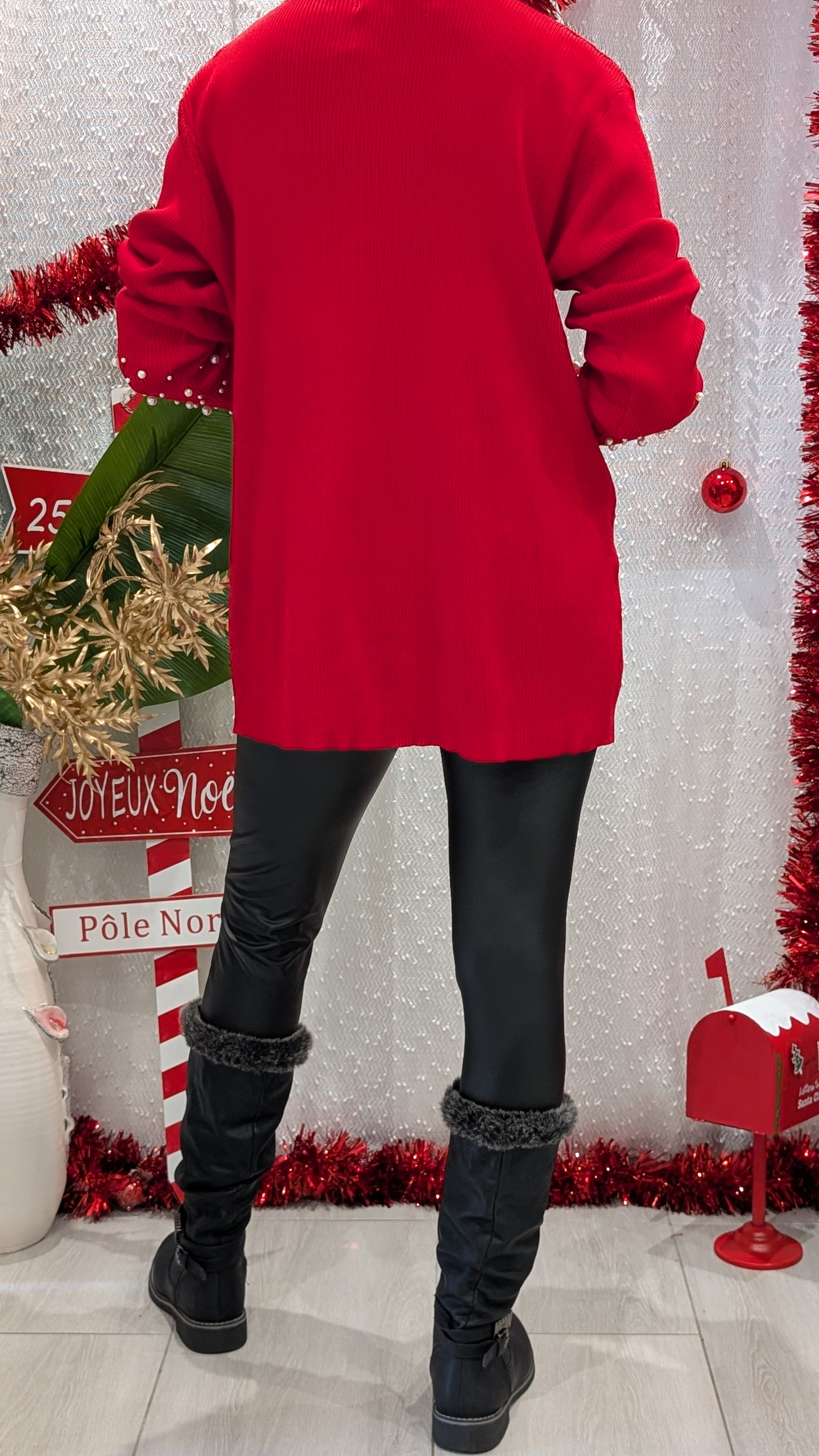 Ce pull rouge éclatant mêle douceur et raffinement. Son tissu finement côtelé épouse délicatement la silhouette, tandis que le devant et les manches, ornées de petites perles, ajoutent une touche chic et féminine. Idéal pour les fêtes ou les journées d’hiver élégantes, il se porte facilement avec un legging ou un pantalon noir pour un look à la fois confortable et sophistiqué.