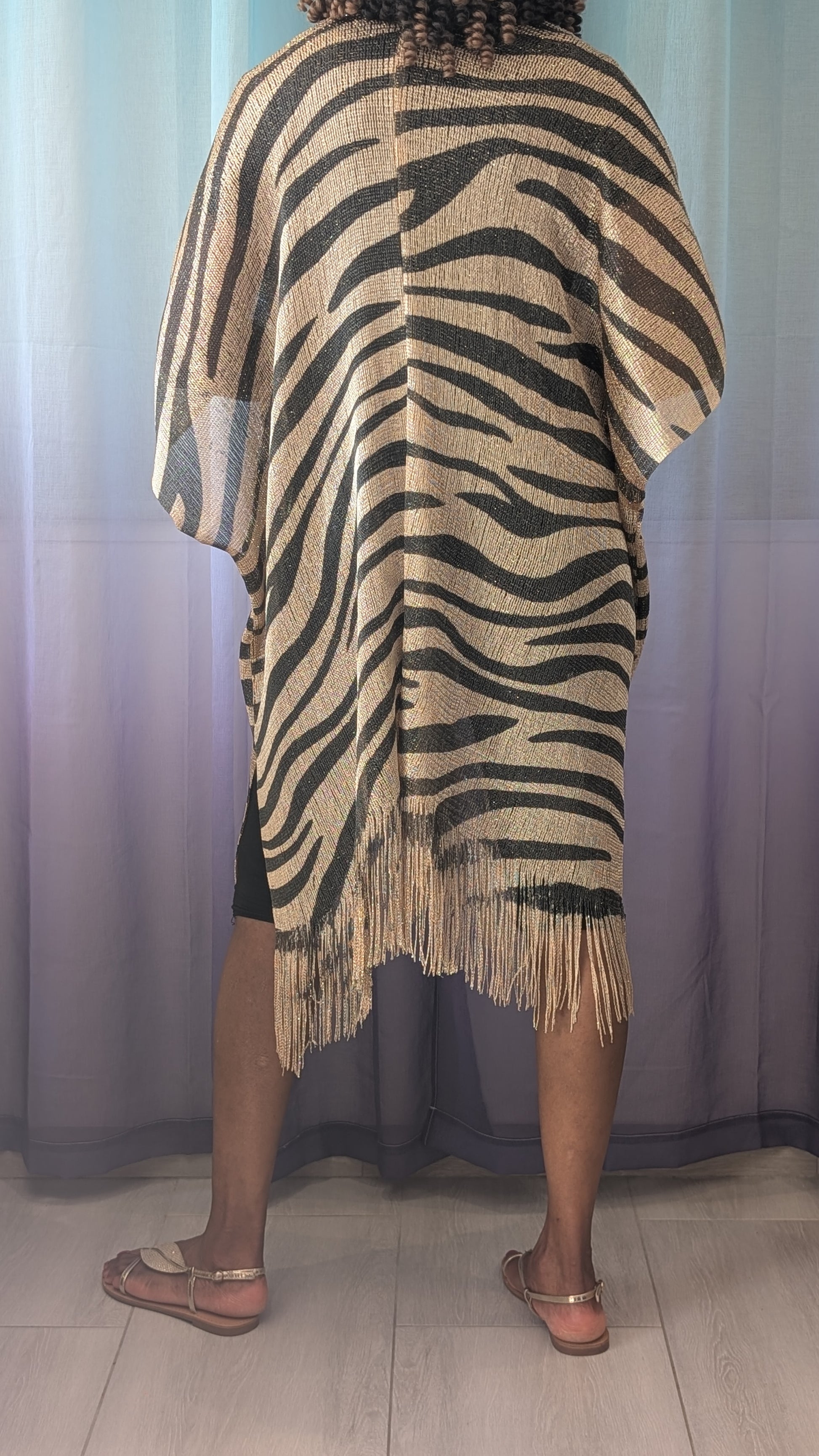 Savane Dorée est un kimono fluide aux reflets subtils, orné d’un motif zébré noir et doré qui évoque la chaleur et le mystère des terres africaines. Légèrement scintillant et terminé par des franges délicates, il danse au rythme des mouvements. Idéal pour rehausser une tenue sobre ou accessoiriser une robe noire, ce kimono est une invitation à l’élégance sauvage.