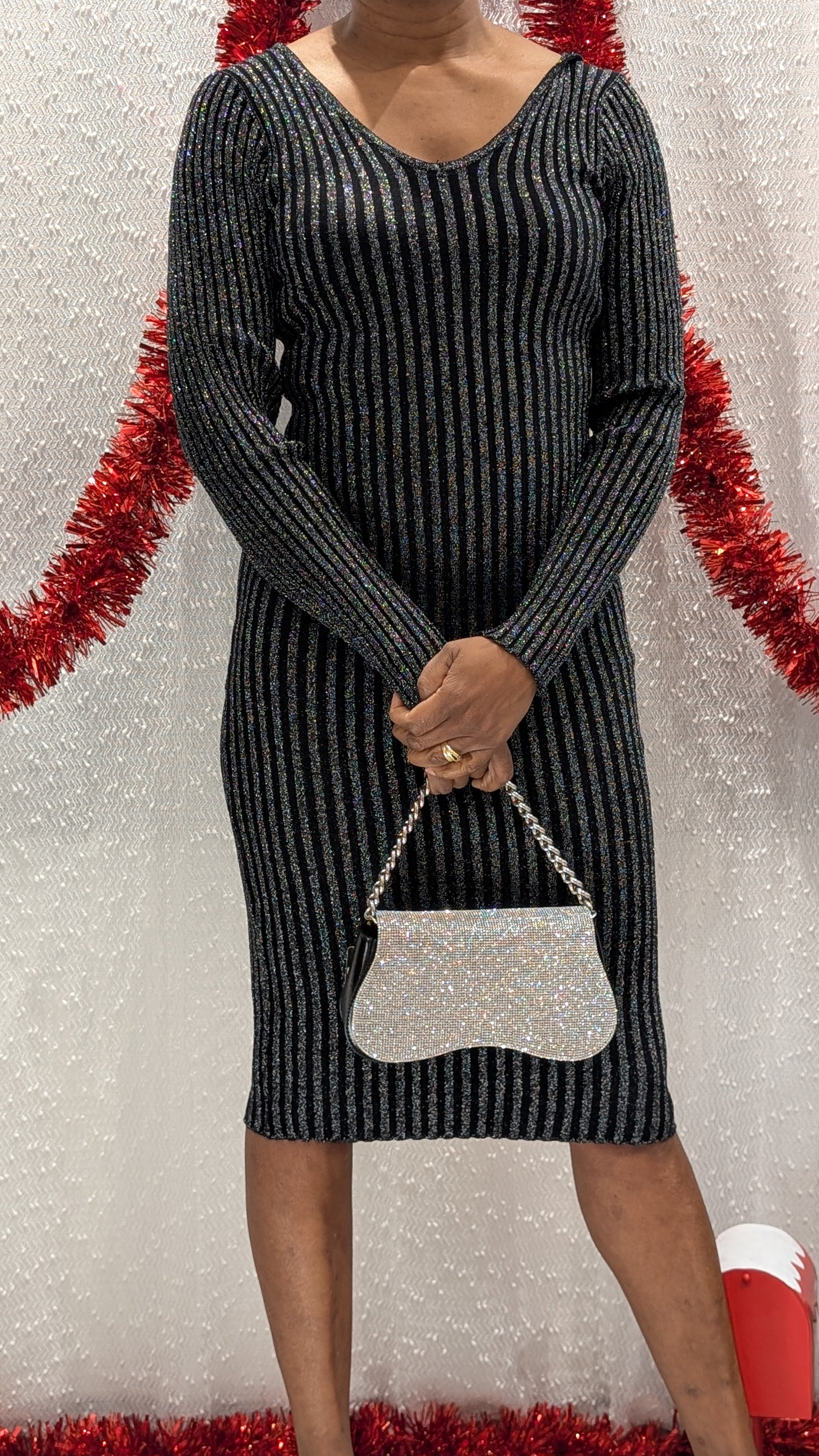 Robe midi noire à rayures pailletées verticales, sublimée par un tissu extensible qui épouse la silhouette sans la comprimer. Son décolleté en V apporte une touche féminine, tandis que les manches longues équilibrent l’allure. Une pièce chic et lumineuse, pensée pour briller lors des soirées, fêtes ou événements où l’on veut être élégante… sans en faire trop.